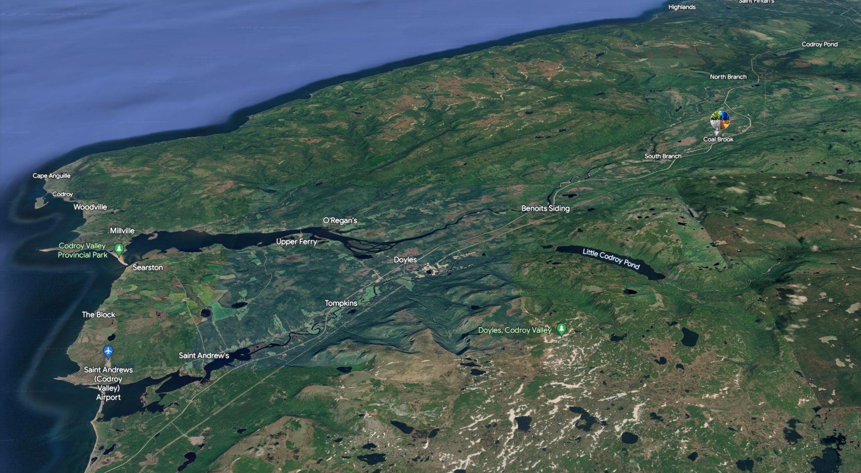 Coal Brook: Located north of South Branch, the derivation of the towns name is based upon the fact that a 13 cm (5 in) coal seam was found along the brook 5.5 km (3.5 mi) north of South Branch.