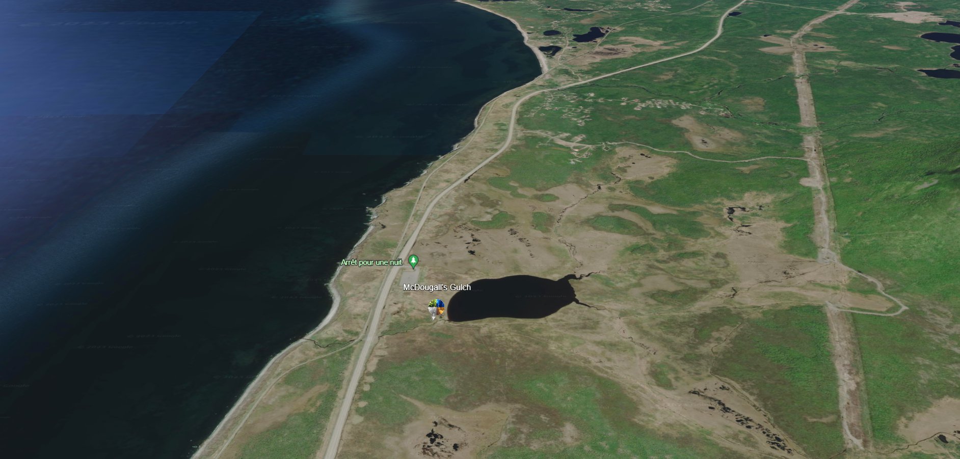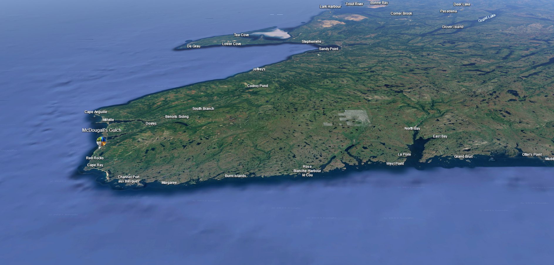 McDougall's Gulch: Located 20 km (12.4 mi) NW of Port aux Basque, before it was "resettled" this railway-siding community had a population of 5 settlers.