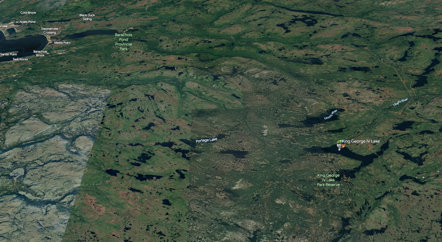 King George IV Lake: Located inland, northwest of Burgeo, in recounting the story of meeting up with another traveller, Cormack makes the following comment: