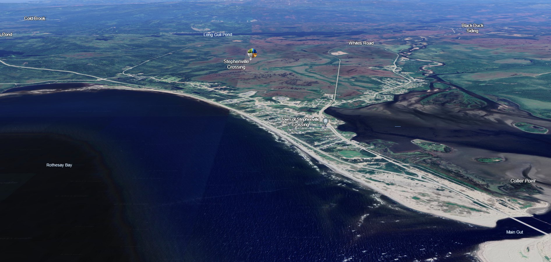 Stephenville Crossing: Located 2.5 km (1.5 mi) east of Stephenville, at the easternmost limit of St. George's Bay, this community had it beginnings as a "crossing" (i.e., railway station) for the Newfoundland railway which ran through the community on its from Port aux Basques to Corner Brook.